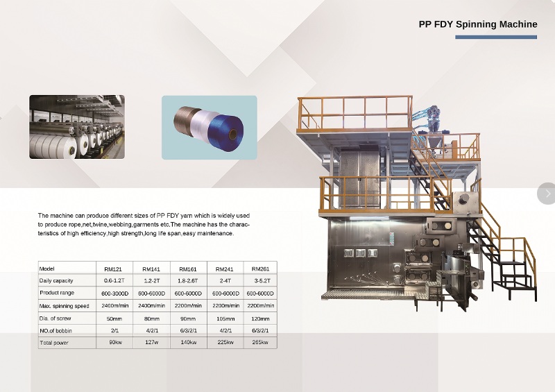 The machine can produce different sizes of PP FDY yarn which is widely used to produce rope,net,twine,webbing,garments etc.The machine has the characteristics of high efficiency,high strength, long life spac,easy maintenance.