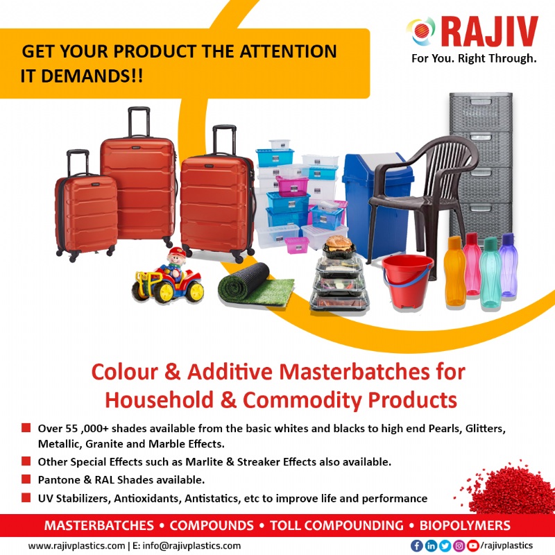Rajiv Plastics offers advanced Colour & Additive Masterbatches designed specifically for household and commodity plastic products. Choose from over 55,000+ shades, ranging from classic whites and blacks to premium effects like pearls, glitters, metallics, granite, marble, marlite, and streaker finishes. Their formulation expertise includes Pantone & RAL shade matching and incorporates performance enhancers such as UV stabilizers, antioxidants, and antistatic additives to boost product longevity and functional properties. Ideal for items like containers, furniture, bottles, suitcases, household gadgets, and everyday plastic essentials, these masterbatches ensure vibrant color consistency, special visual effects, and superior additive benefits. Unlock new levels of attention and market appeal for your products, backed by robust quality and innovation from Rajiv Plastics