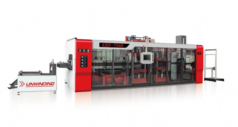 The machine has three working-station combination of forming, cutting and stacking, integrated with mechanical, electrical control and pneumatic.Each action procedure is controlled by SIEMENS PLC. Touch screen operation is simple and convenient. Advance sheet feeding has the function of automatic memory of heating time, which enables the machine to enter the normal working state from the first edition. The height of the upper die is adjusted by electric motor, which is fast and convenient