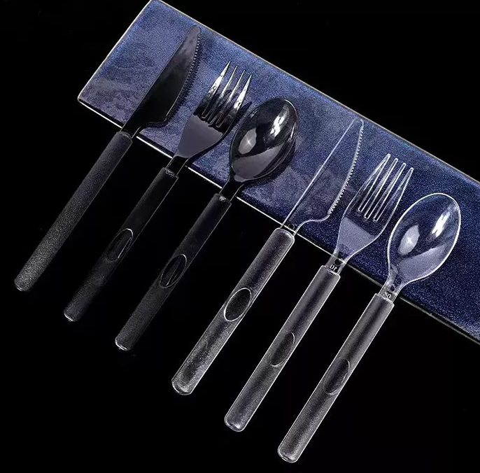 This disposable cutlery set (knife, fork, spoon) stands out with its dual-style design: matte black and clear transparent options, balancing elegance and versatility for events like weddings, parties, or catering.