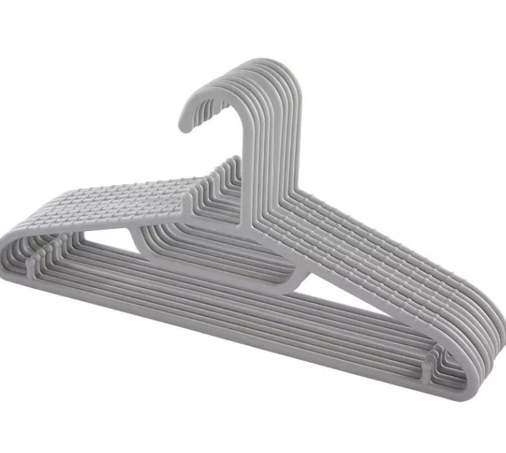 Product Name: Non-Slip Plastic Clothes Hanger (Set) Product Features: This set of plastic hangers balances functionality and space-saving design: Non-slip texture: The grid-patterned shoulder area prevents clothes (like shirts, dresses) from slipping off, keeping garments neat. Space-efficient: Stackable design allows compact storage; the slim profile maximizes closet space, fitting more clothes in limited areas. Durable & lightweight: Sturdy plastic construction supports daily use without bending, while its light weight makes it easy to handle. Practical hook: The curved hook fits standard closet rods, and the neutral gray color complements any wardrobe style. A cost-effective, reliable solution for organizing clothing.